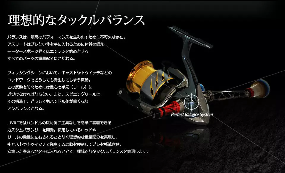 A limited edition Livre X Squid Mania custom balancer can be attached to the reel for the purpose of being of control the centre of gravity for the reel. It is a counter weight for the handle weight which leads to better balance and less wobble.