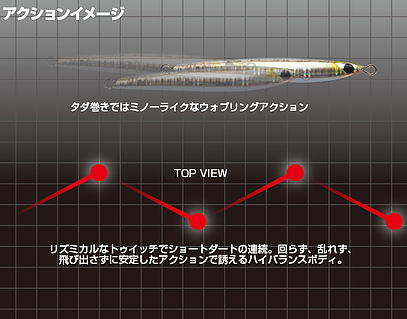 - Horizontal free fall wobbling action on drop that imitates a fleeing bait fish