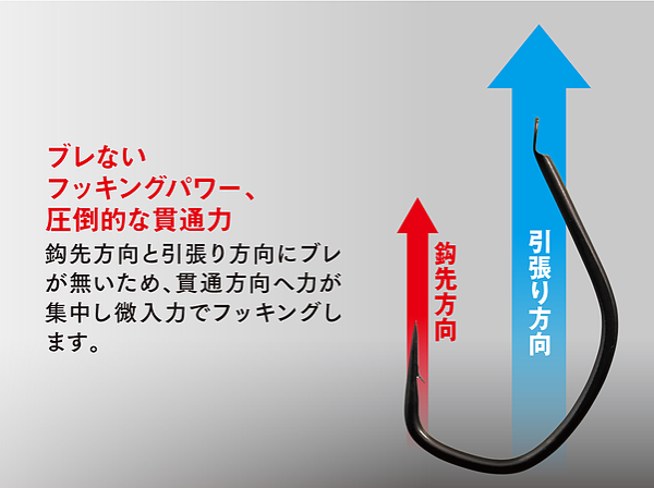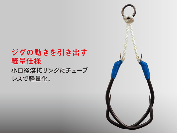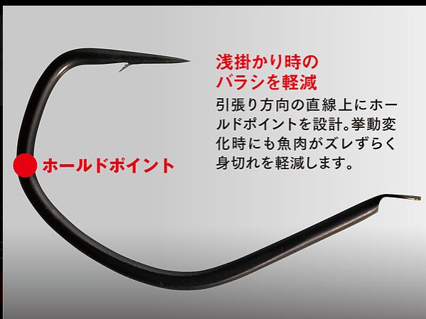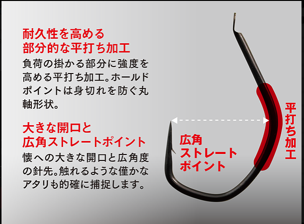 A hunting hook with a wide-angle straight tip that instantly catches prey. The best shape for light jigging games that sticks the moment a fish touches it.