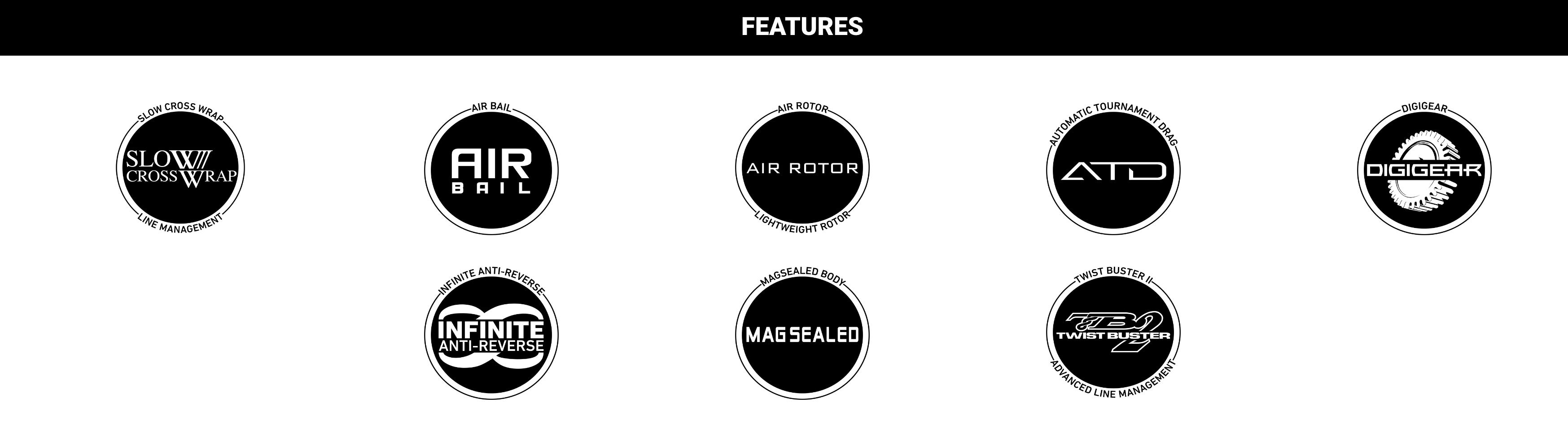 The long-stroke design spool combined with Daiwa’s new Slow Cross Wrap oscillation system results in improved casting distance and line management. Air Rotor and Air Bail are also equipped to lower inertia for smooth effortless winding and also aid in line management.