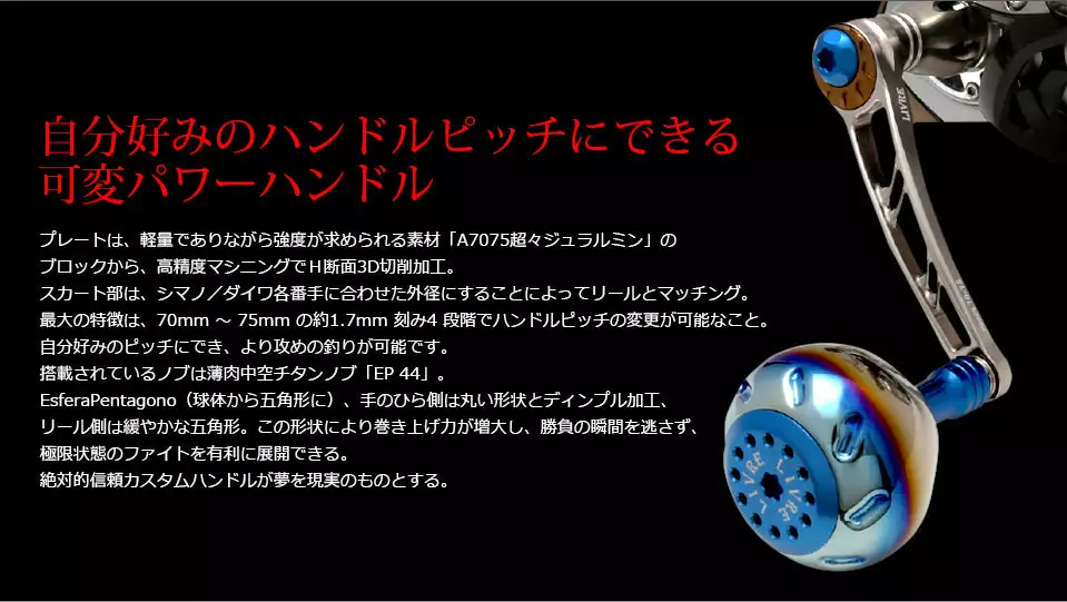 A custom handle + handle knob set by Livre Japan suitable for smaller sized reels for more crank and torque. The specially designed power handle will enable anglers to wind lures easier and have more control when fighting a fish.